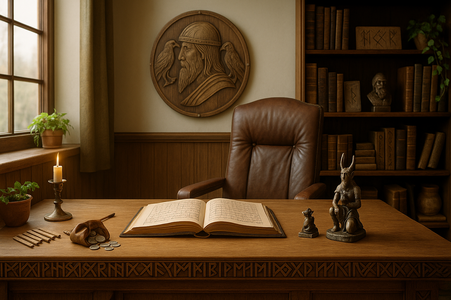 Ses repères sont la droiture, la parole tenue, l’esprit de service et la rigueur — des valeurs qu’il puise dans son affinité avec Týr et Ullr, et qu’il s’efforce d’incarner au quotidien : constance, précision du geste, calme des saisons froides, et respect de chacun·e.