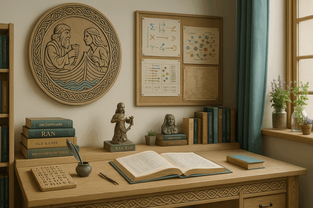 Pratiquante dévouée, elle honore plusieurs divinités nordiques, avec une affinité particulière pour le couple marin Rán et Ægir, source d’inspiration pour explorer langues, mythes et coutumes au fil des marées.